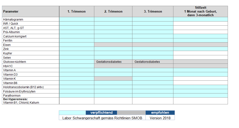 Die Beratung fokussiert auf die ernährungstherapeutische Betreuung und Kontrolle ausreichender und angepasster Substitution der Vitamine und Spurenelemente in der Schwangerschaft gemäss der SMOB Richtlinien.
