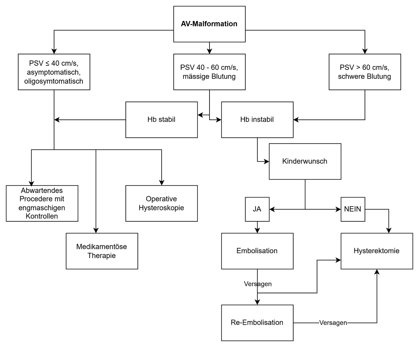Es besteht kein Therapie-Konsensus. Die Therapie soll individuell, Klinik-basierend, je nach Grösse/PSV der AVM sowie Wunsch nach Fertilitätserhalt erfolgen.