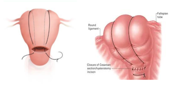 Kompression des gesamten Uterus inkl. des unteren Uterinsegmentes; Reduktion der uterinen Blutversorgung durch Ligatur der zuführenden Gefäße (Aa. uterinae und Rami uterini der Aa. ovaricae). Longitudinale „Rucksacknaht“ mit Inzision im unteren Uterinsegment.